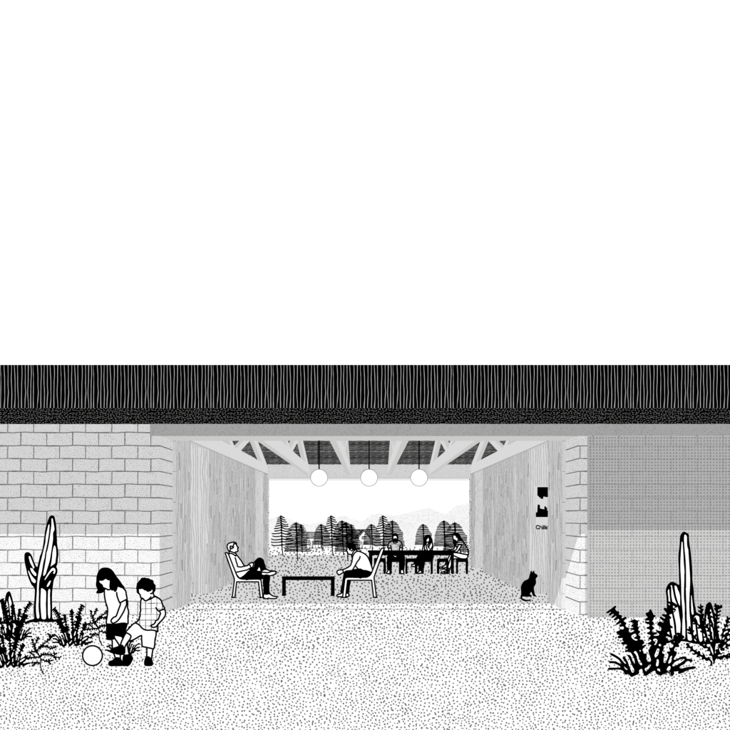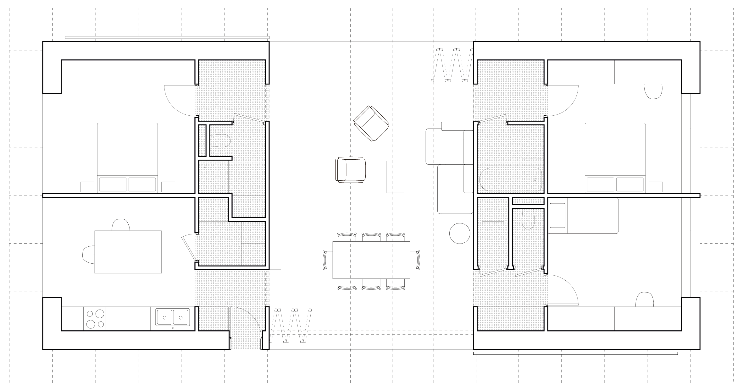 L’habitation s’organise autour d’un espace traversant pour la vie collective, s’ouvrant intégralement pour devenir une grande pièce extérieure aux beaux jours. La maison est construite selon des procédés de construction élémentaires faisant la part belle aux matériaux bruts, en réponse à une recherche d’économie de moyens.