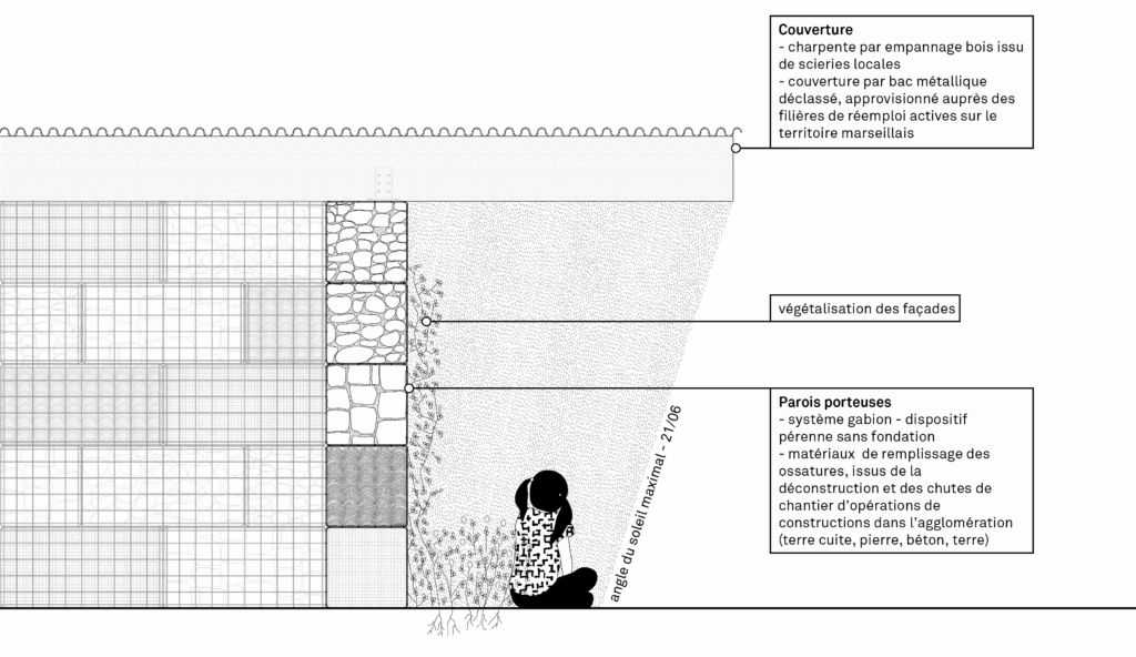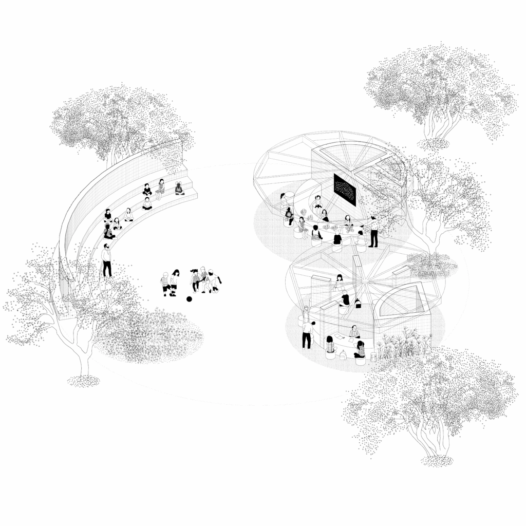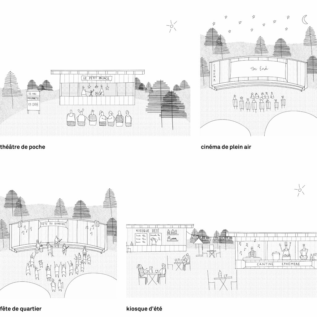 Le projet propose la mise en œuvre de trois petites architectures dans le parc de Font Obscure, définissant un espace pédagogique modulable et polyvalent. Hors temps scolaire, ces éléments deviennent des micro-équipements pour le quartier.