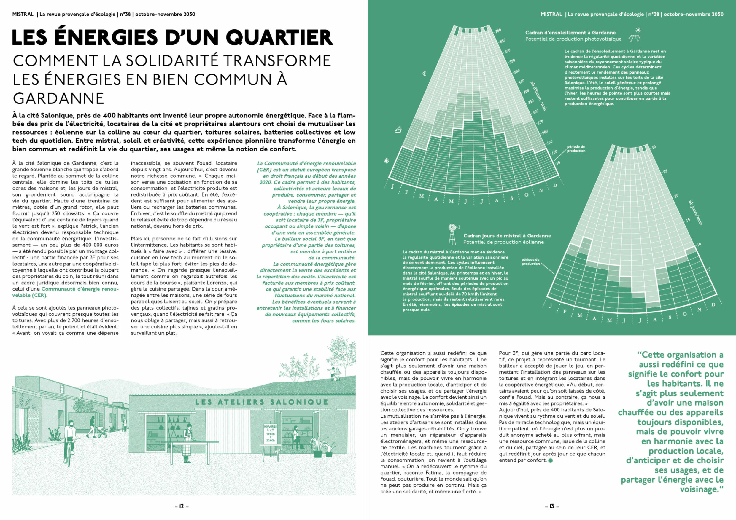 Une filière coopérative s’organise autour de ressources locales. Une communauté énergétique mutualise éoliennes et solaire, invitant à une culture collective de l’intermittence. Venelles, vergers et places ombragées structurent un paysage habité, support de solidarités.